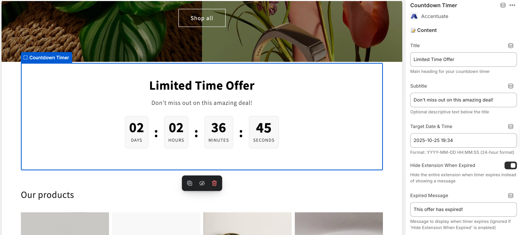 The **Countdown Timer** is designed to help you create urgency and excitement on your storefront. In the fast-paced world of e-commerce, creating a sense of urgency can **significantly impact** your sales and conversions.&#x20;