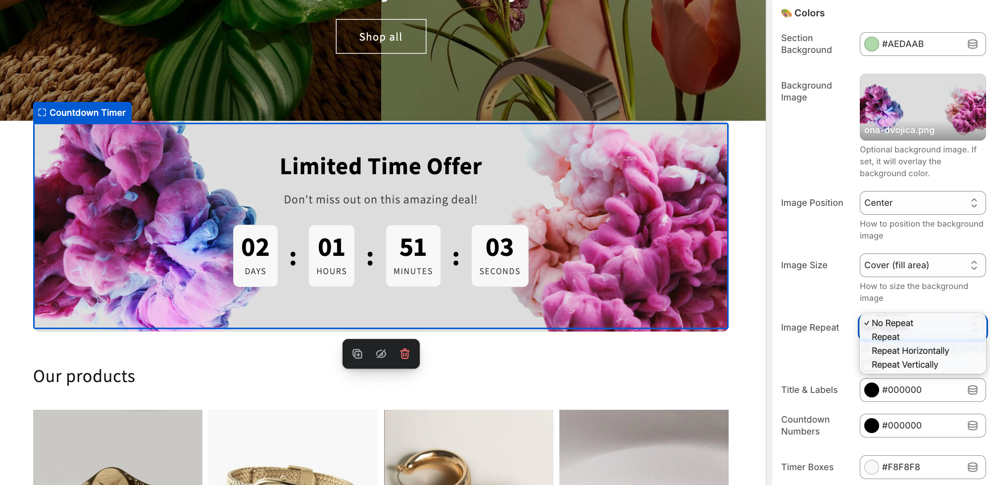 5. In the **Colors** section, you can set a **background color** or upload a **background image** to make the timer stand out. Adjust how the image appears using **Image Position**, **Size**, and **Repeat** options.\