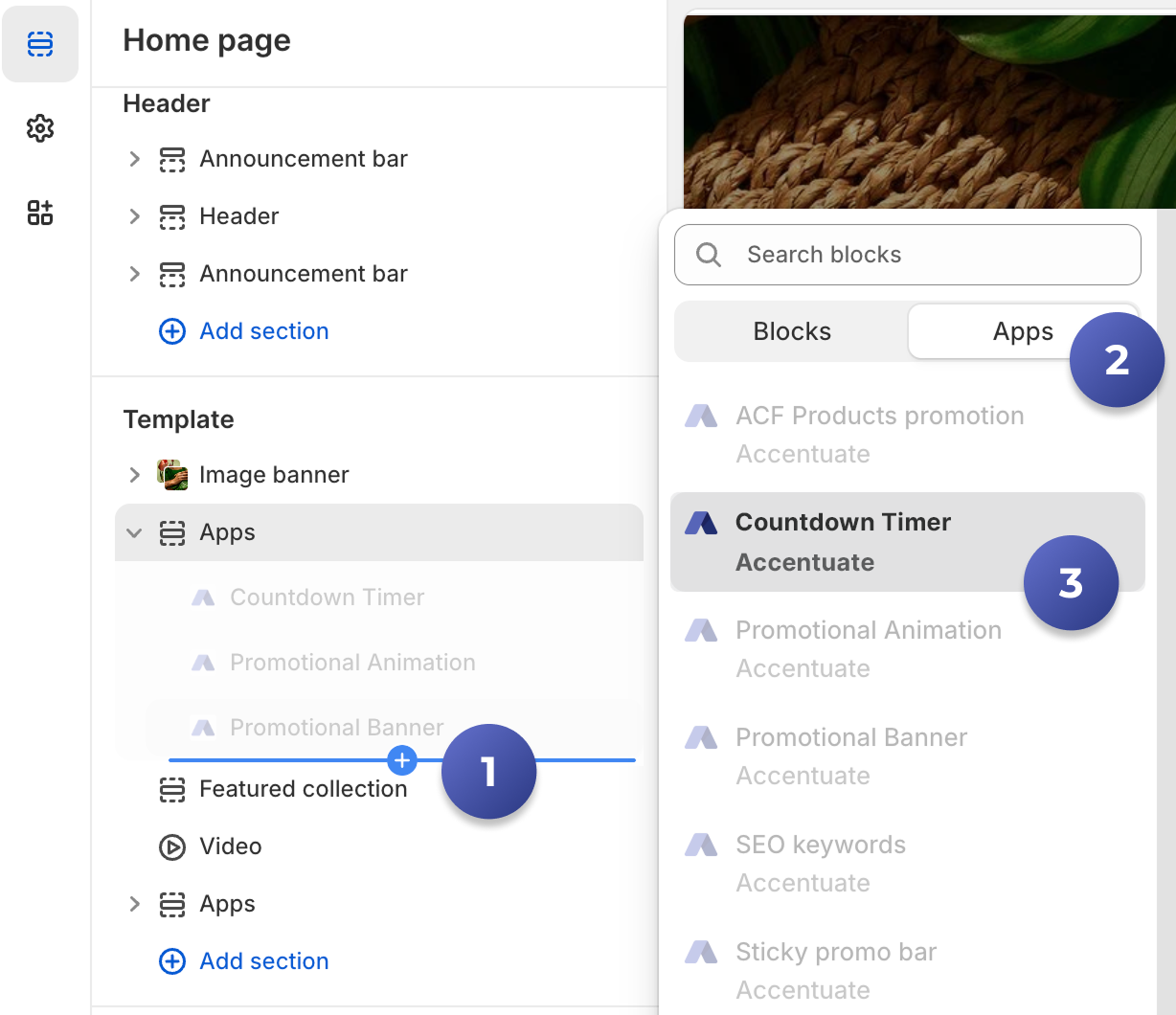 3. Click **Add block / section →  Apps** and select **Countdown Timer**
